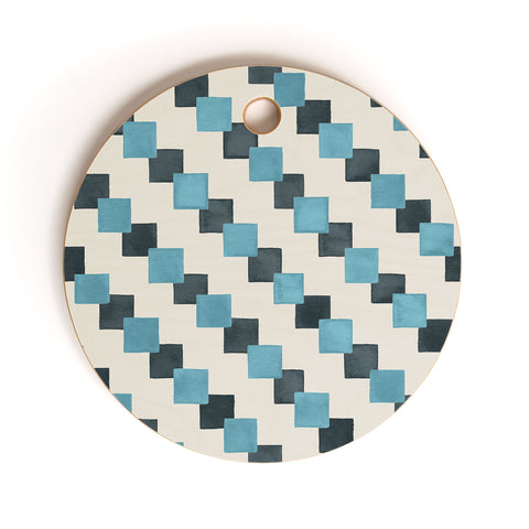 Ninola Design Geometric Watercolor Blue Navy Checkered Tiles Cutting Board Round
