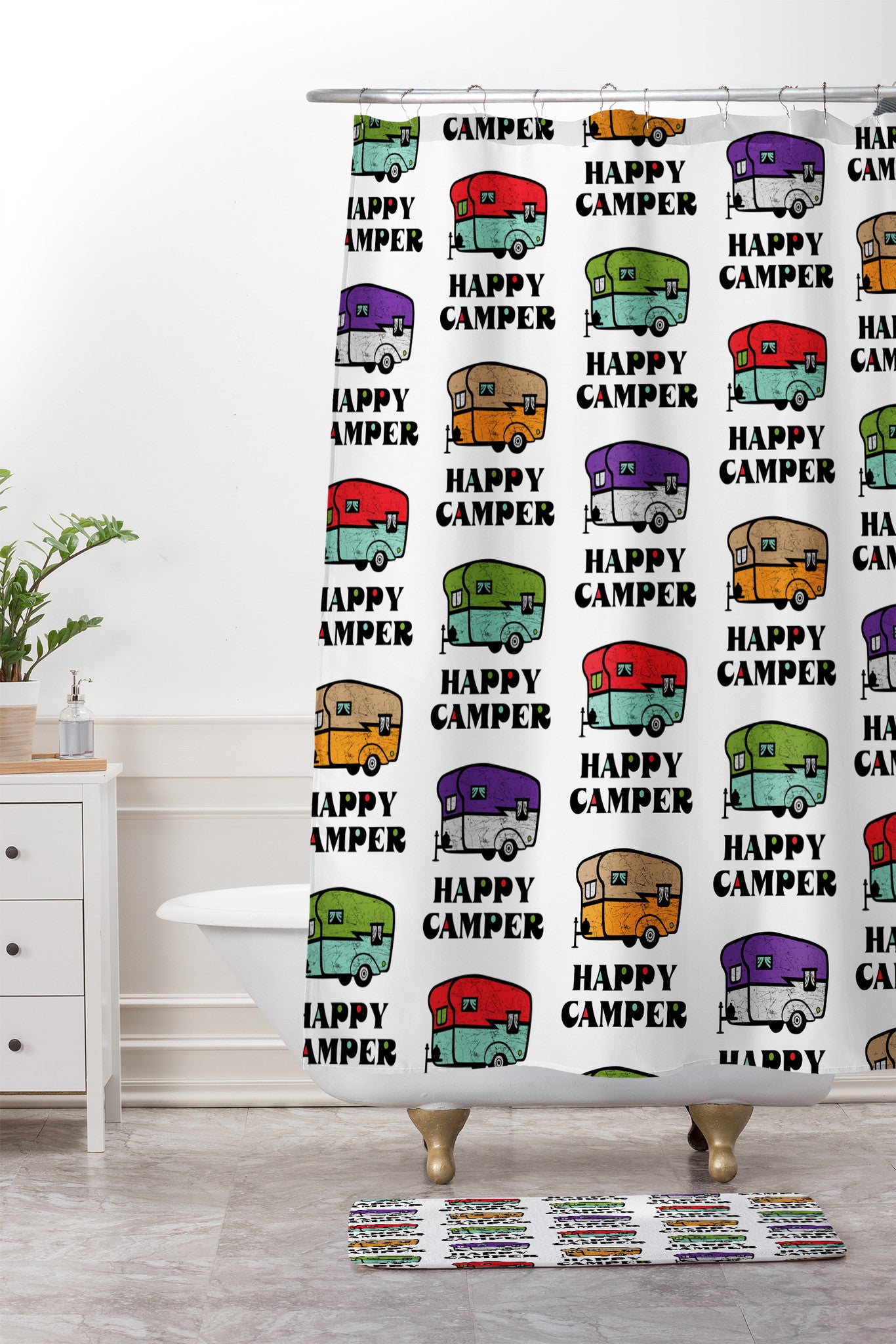 Andi Bird Happy Camper White Shower Curtain And Mat
