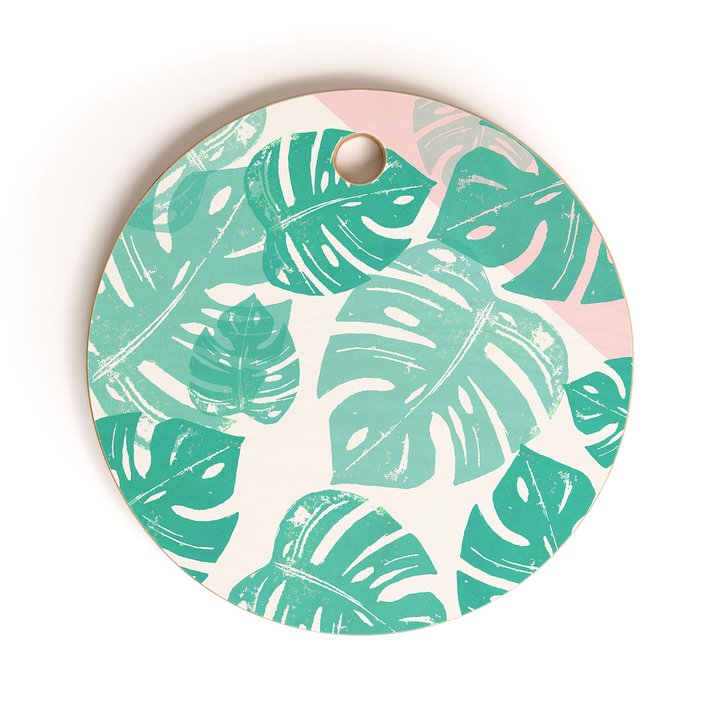 Bianca Green Linocut Monstera Rosy Cutting Board Round