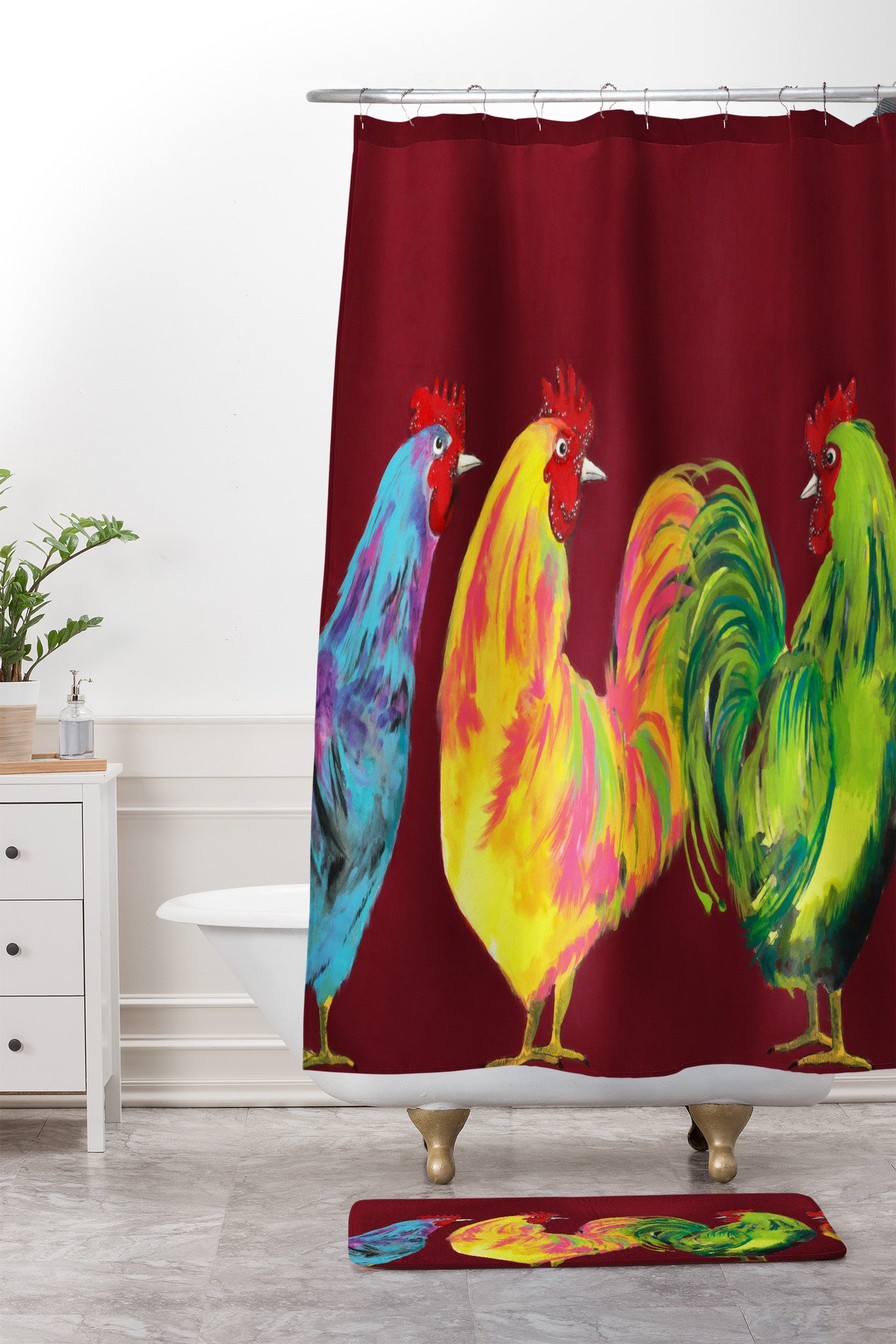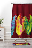 Clara Nilles Rainbow Roosters On Sangria Shower Curtain And Mat