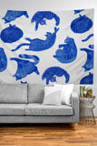 H Miller Ink Illustration Sleepy Cozy Kitty Cats in Blue Tapestry