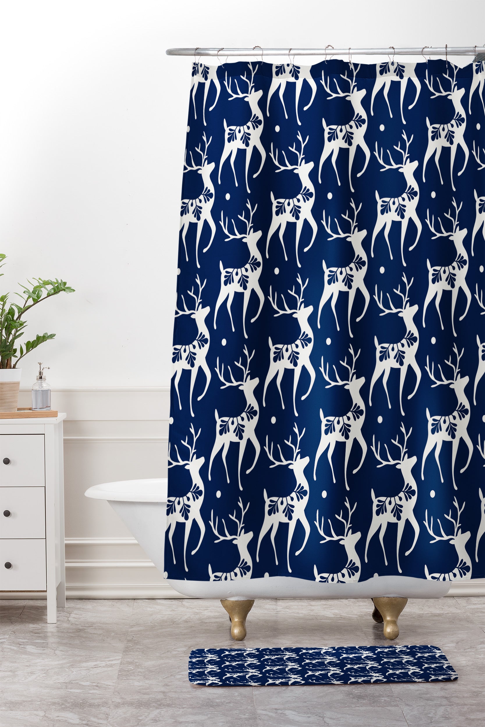 Heather Dutton Dashing Through The Snow Deer Navy Shower Curtain And Mat