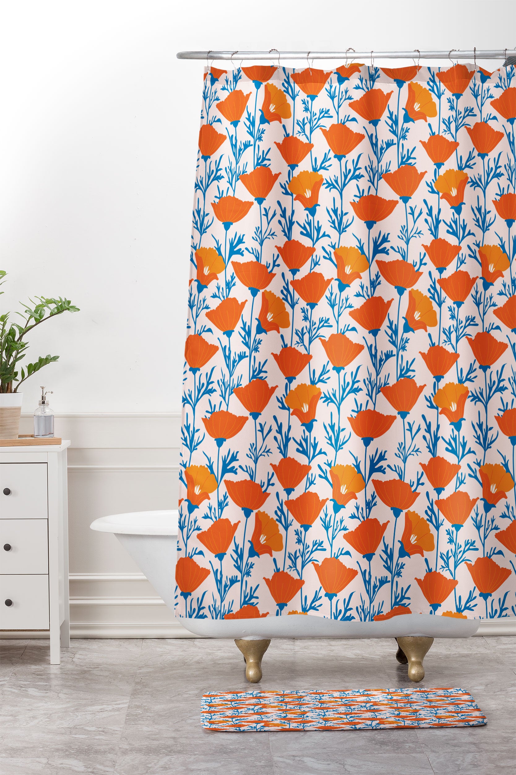 Insvy Design Studio California Poppy Orange Blue Shower Curtain And Mat