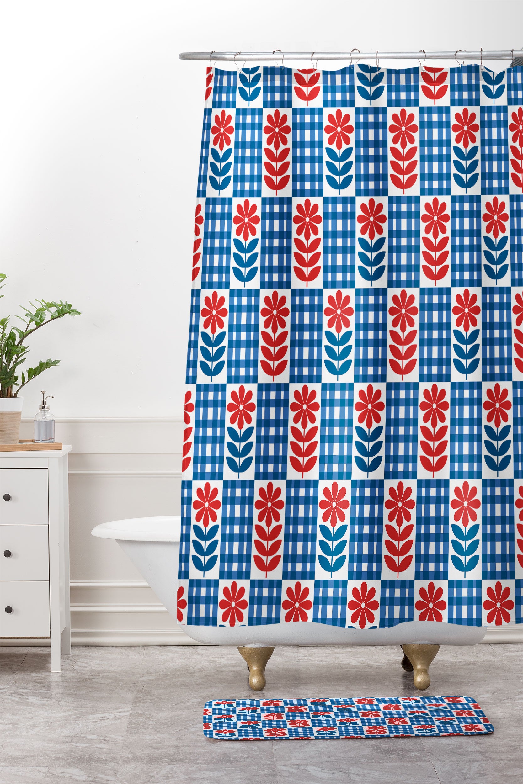 Jenean Morrison Gingham Floral Blue Shower Curtain And Mat