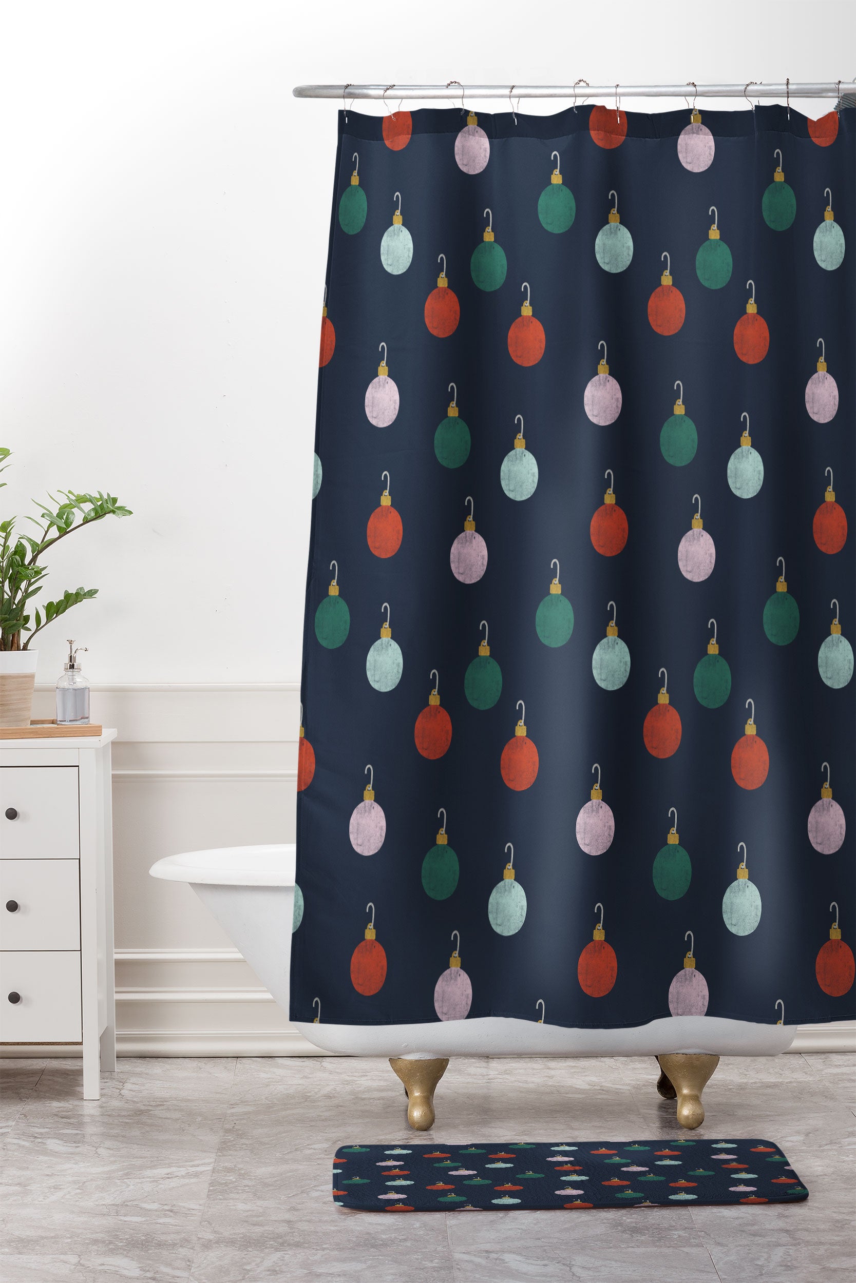 Little Arrow Design Co christmas ornaments on navy Shower Curtain And Mat