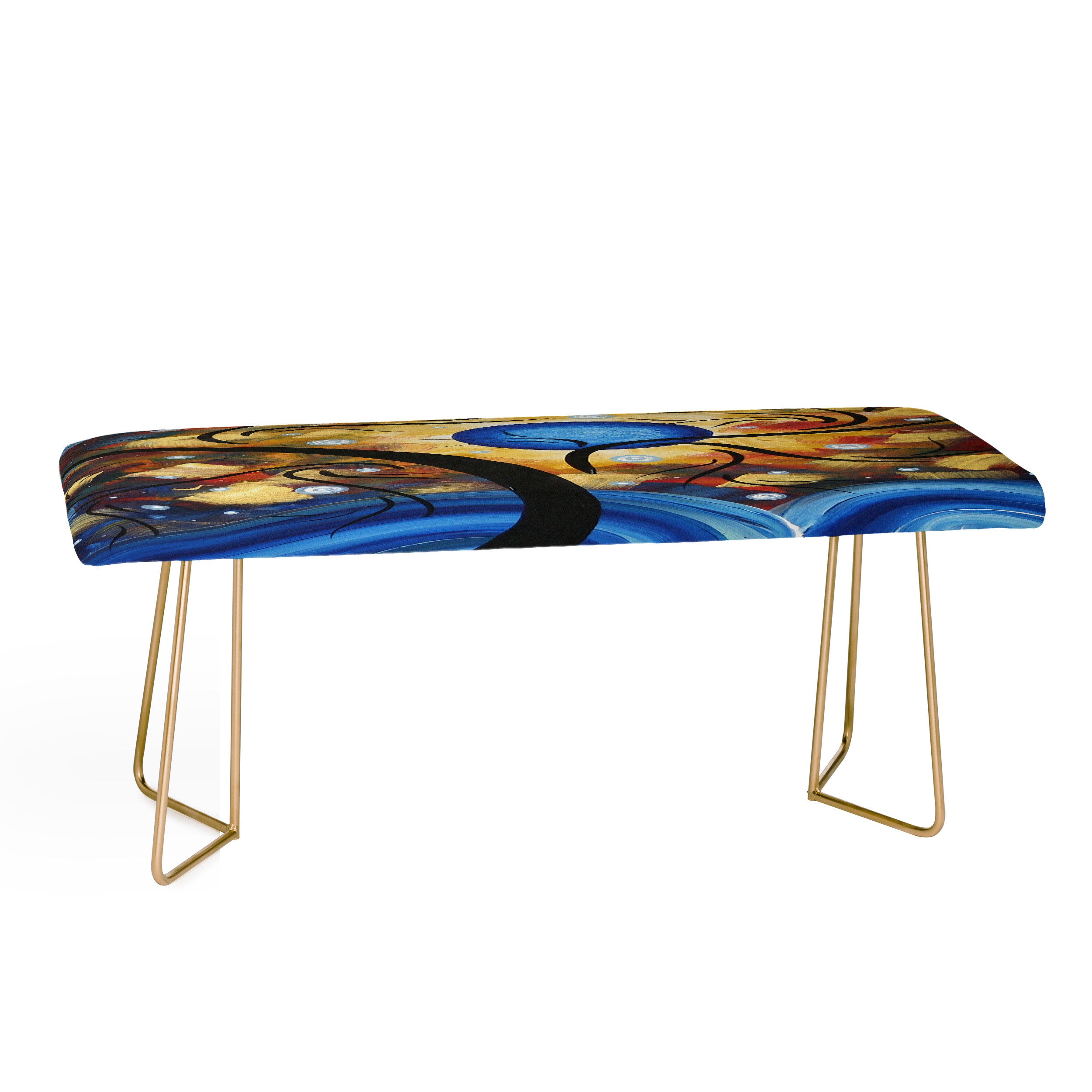 You may now approach the bench. The Deny Designs bench is the versatile furniture staple your space is missing. You can select from our curated designs to be featured on the wrapped, faux-leather seat. The sturdy yet minimalistic steel aston legs, available in gold or black, allow our benches to be seamlessly integrated into whatever decor style you fancy. Dress it up as chic dining room seating or dress it down as an entryway catch-all. And the best part? Every purchase pays the artist who designed it—supporting creativity worldwide.