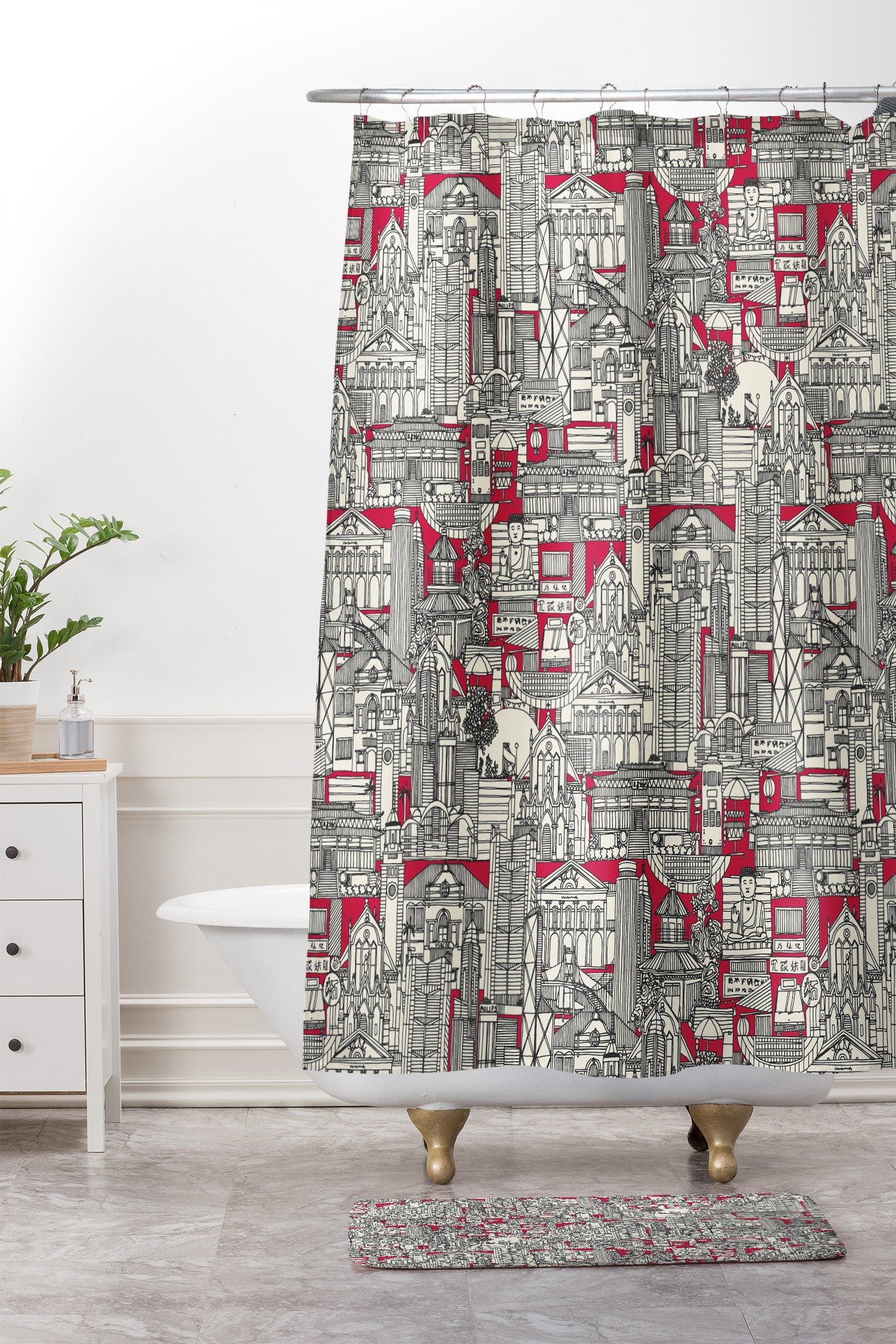 Sharon Turner Hong Kong toile red Shower Curtain And Mat