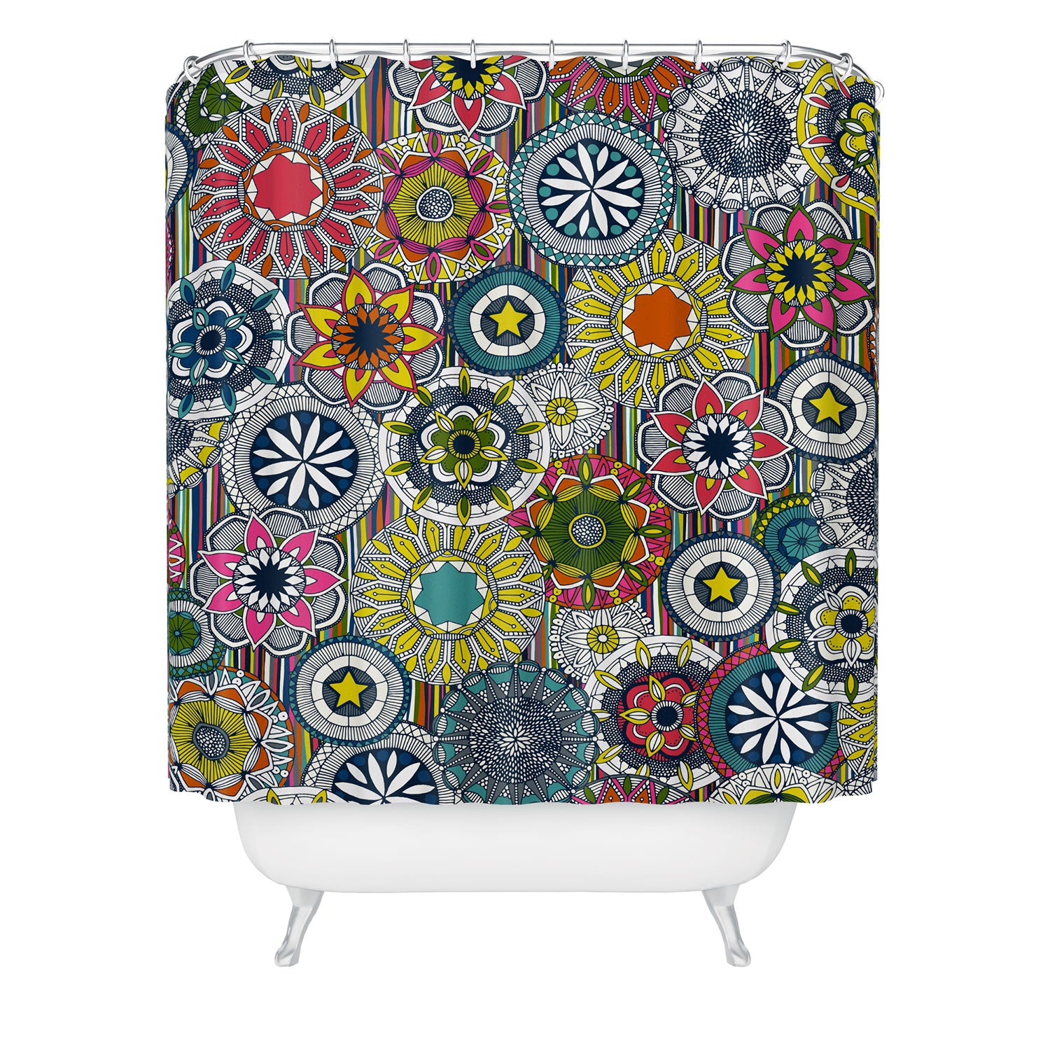 Set the stage. The Deny Designs shower curtain is crafted from 100% woven polyester and makes the perfect backdrop for whatever your bathroom decor may be. Adding some design to your shower curtains is a great way to make a statement in a room known for presenting plenty of design challenges. The buttonhole openings along the top means that you're free to use any curtain rings or hooks you please. And the best part? Every purchase pays the artist who designed it—supporting creativity worldwide.